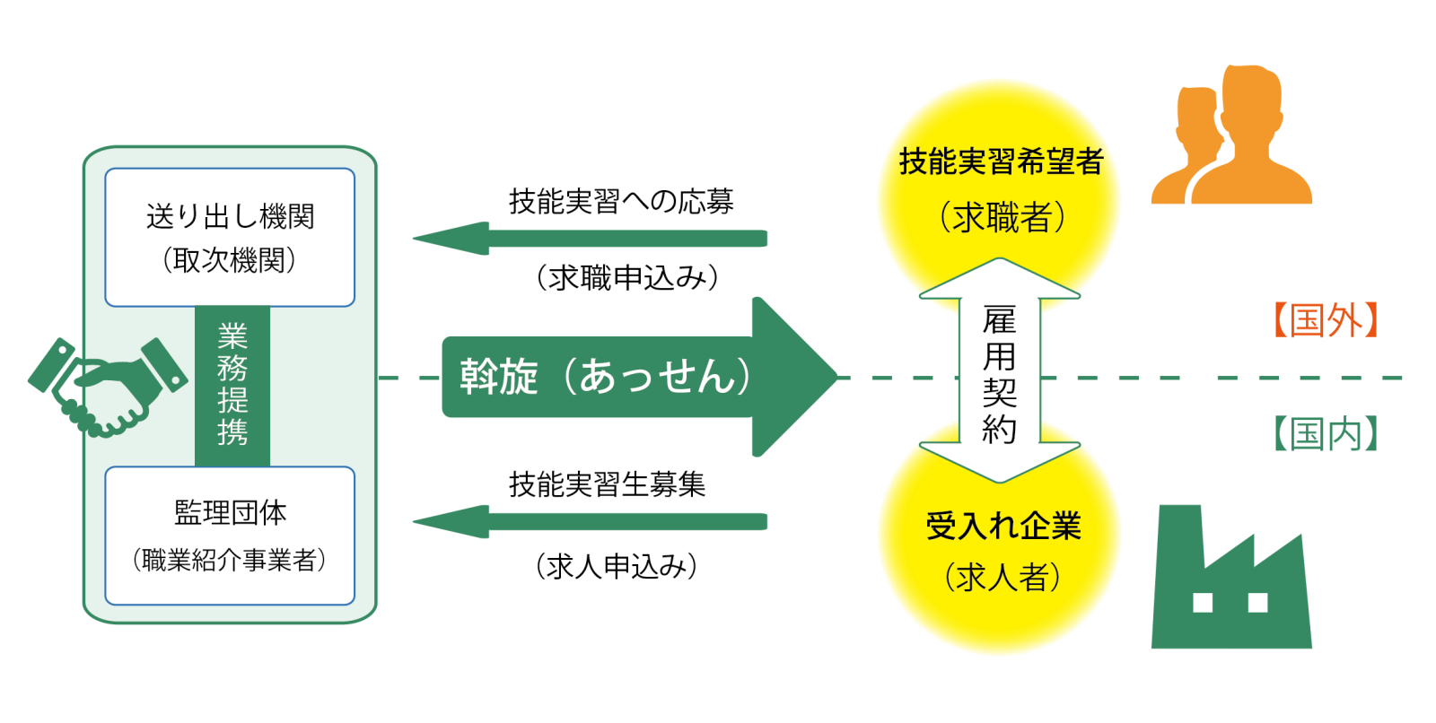 我が国の国際協力・国際貢献の重要な一翼をになっています。受入れ企業は、法務大臣・厚生労働大臣の許可を得た監理団体を通じて受入れることができます。